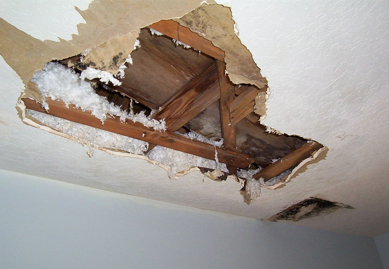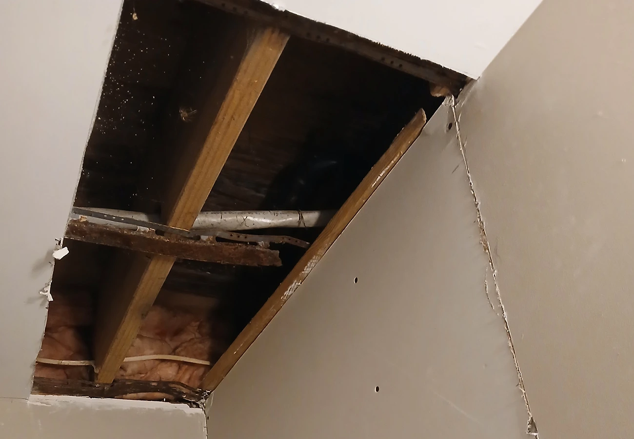 The ceiling drywall is removed to expose joists and insulation, allowing access for repair and restoration.
