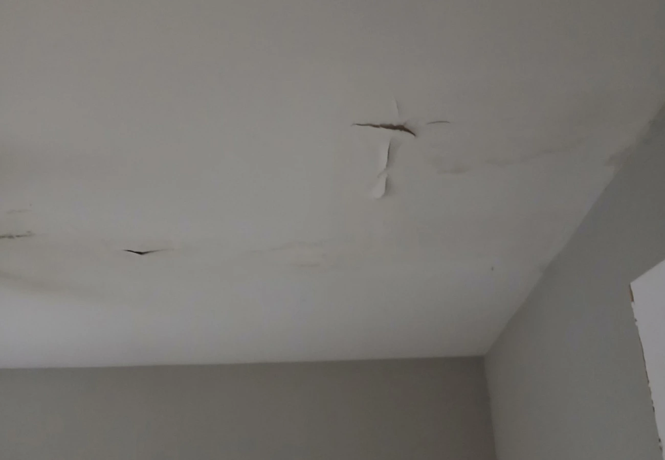 Bubbling, cracking, and discoloration appear in the ceiling — a clear indicator of underlying structural or environmental issues.
