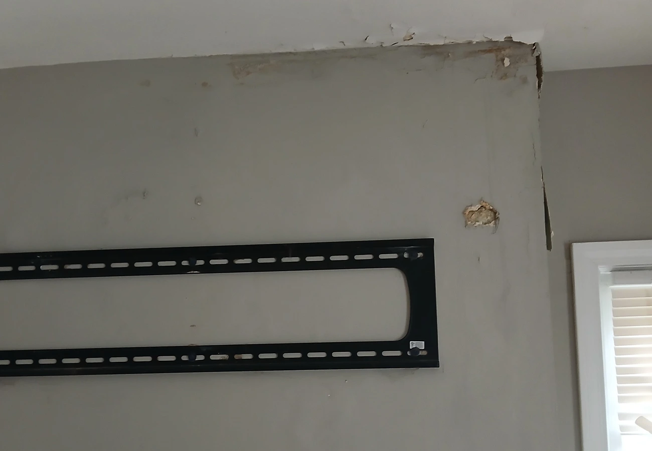 Minor water damage around the mounted TV area begins to appear, showing bubbling paint and surface cracks.